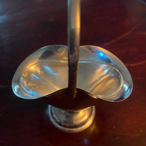 Salt bøsse i glass og ett hjerteformet lite fat i sølvplett selges samlet.