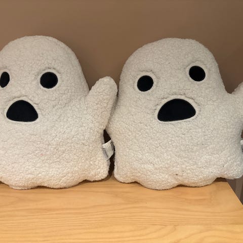 Fire puter, en isbjørn-bamse, en pingvinlampe (batteri), og Halloween-kostymer - ett spøkelse og en lang svart kappe med hette (hetten er ca str 14 år), en hårbøyle med edderkopp og to hårklyper med skjelettfingre.