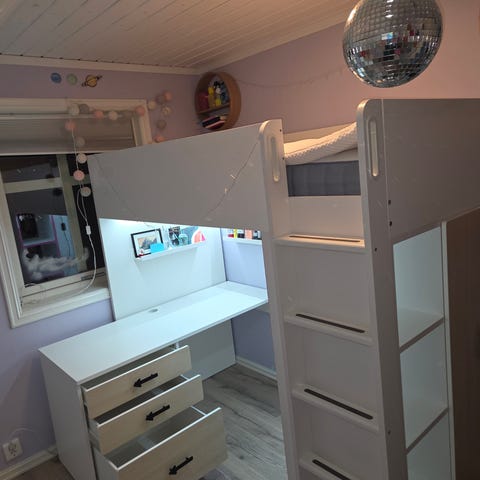 Pult, klesskap og fire skuffer. Sengen er demontert. Selges uten madrass.