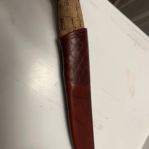 Kniven er ikke brukt, altså knivbladet. Men jeg har slipt den en gang med en av brusletto sine slipere. Og jeg hadde den med meg på tur i sommer, og da satt jeg meg på sliren på en stein, så den fikk noen merker.