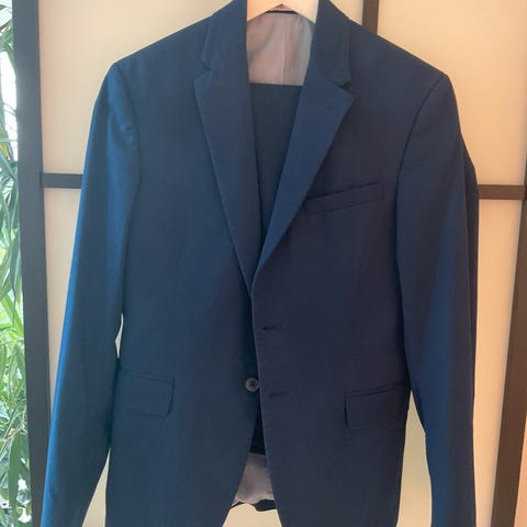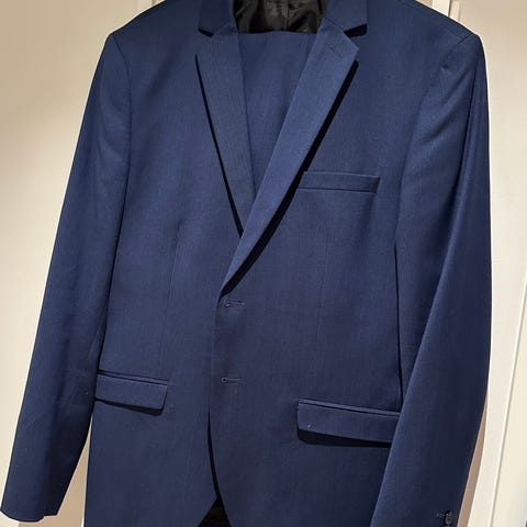 Pent brukt dress, nydelig blåfarge. Jakken har 2 knapper. Buksa er 100 cm i ytterlengde ben og 75 cm innerben.