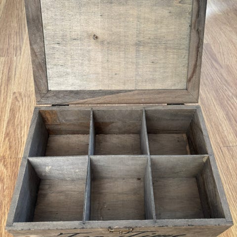 Liten treboks med tøyflagg på lokket. Med metallhengsler.
