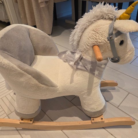 Gyngehest som har stått til pynt på barnerommet, men veldig lite brukt. Sikkert sittet på den kanskje 5 ganger😂 kosta 899 ny på barnas hus.