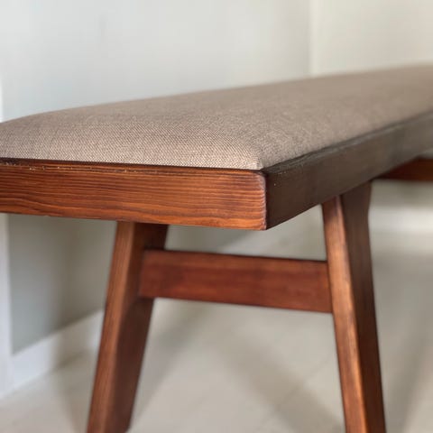 Kveld benk 186 fra det norske designmerket Ygg & Lyng. Benken er laget av heltre og finér med No-sag fjærer, setepute med kaldskum med dacron svøp.