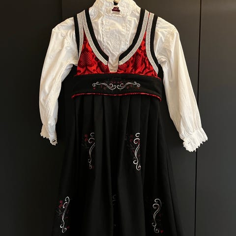 Pent brukt festdrakt. Stakk, forkle, lomme og sjal i fargen lilla/ svart. Strl 128