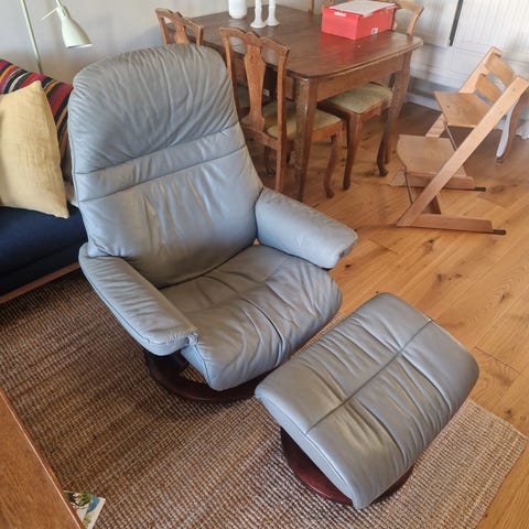 Synlig brukt, men fortsatt veldig fin stressless i mørkebrunt skinn med fotskammel selges. Pen og hel overalt. Kan dreies og justeres i ryggen og nakken. Mørkbeiset sokkel. Ingen skader i skinnet.