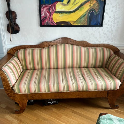 Sofaen er funksjonell og hel, men kunne hatt godt av en omtrekking og litt kjærlighet i form av lakk.
