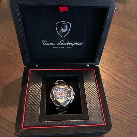 Selger en Tonino Lamborghini Spyder herreur i særdeles god stand. Dette er et unikt og maskulint statement-ur som kombinerer italiensk design med sveitsisk presisjon.