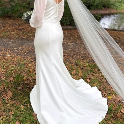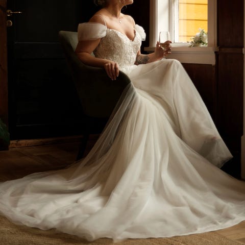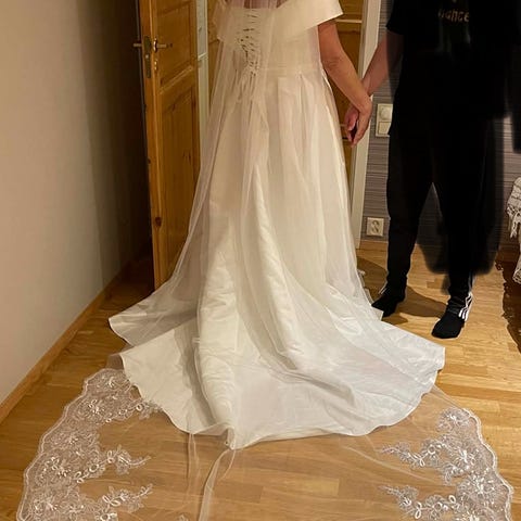 Bryllupskjole i størrelse 38. Kjolen er hvit og har detaljerte broderier på overdelen. Den er designet for å passe til spesielle anledninger som bryllup. Stoffet og snittet gir et elegant utseende.