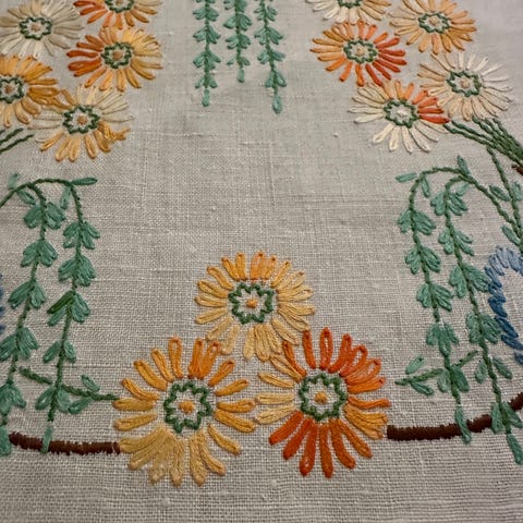 Nydelig håndbrodert Fransk lin laken, sengetøy, brodert i en hvit, lyseblå/ babyblå farge med kremhvit bakgrunn i str 224 cm bred x 294 cm lang. Initialene på broderiet er R og P. Lakenet har en brodert kant som går langs hele bredden på 224 cm, (under de blå initialene) se bilder. Lakenet er i fin stand og kan sikkert brukes til en mengde annet, enn som laken.