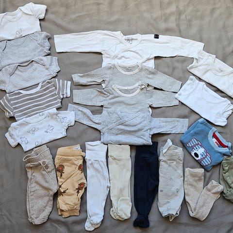 9 plagg - 3 bodyer med lange armer, 3 bukser, 3 genser