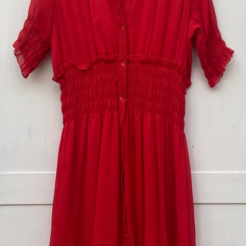 Nydelig midi kjole i rasberryred farge fra Six Ames. Strikk i midje, knytting ved hals , fine rutsje detaljer , glatt og fint viskose stoff. Lite og pent brukt ingen slitasje eller merker. Str 36. Normal i str. Lengde fra skulder ca 120 cm. Nypris 1500,-