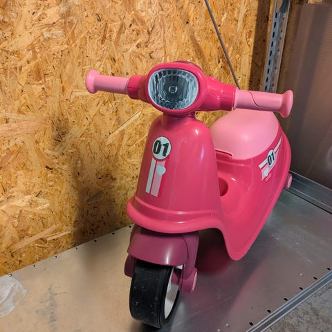 Barnet vil få følelsen av å kjøre på en ekte scooter, ettersom den er realistisk i designet, har en mekanisk nøkkel og plastlys foran.