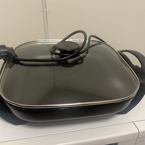 Elektrisk Stekepanne i sort farge. Denne stekepannen har en stor overflate og er utstyrt med et elektrisk varmeelement, noe som gjør den ideell for matlaging av ulike retter. Lokket er solid og håndtaket gir et godt grep. Perfekt for bruk på kjøkkenet eller ved bordet.