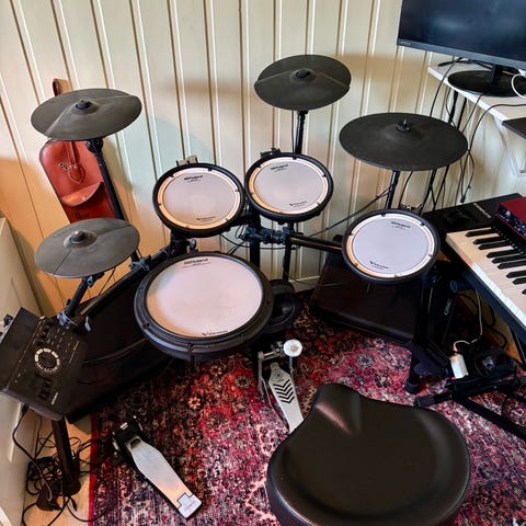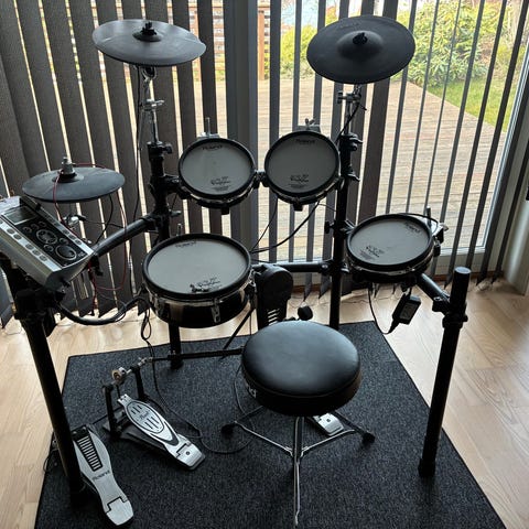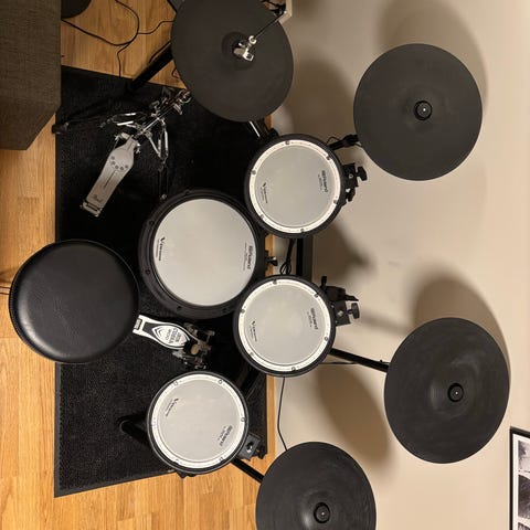 Pent brukt som øvingssett hjemme av en soft-player. Hihat stativ, pedal og stol medfølger ikke.