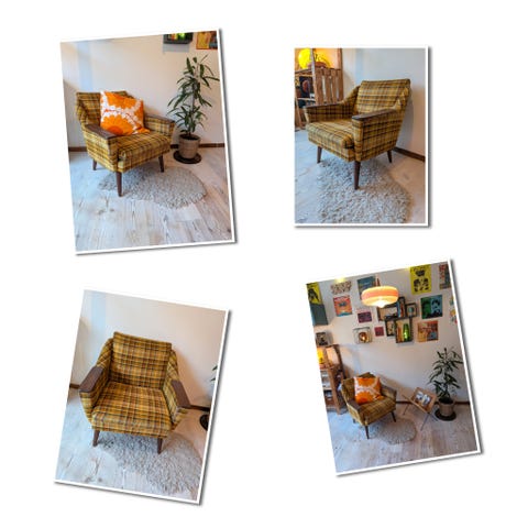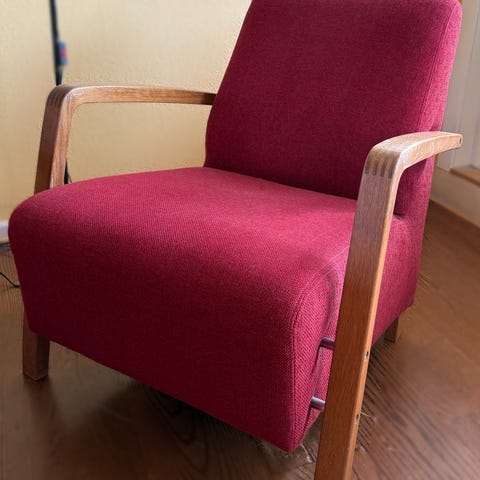 Retro stol trukket i rødt ullstoff fra Kvadrat/Innvik (https://www.innvik.no). Treverket er gylden bjerk. Stolen har en enkel design med armlener og en solid ramme, og den er ideell for stue eller lesekrok. Rammen har noen små bruksmerker.