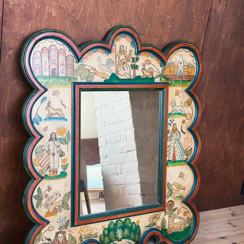Stort innrammet speil fra 1960- og 1970-tallet med massiv ramme med håndmalte bilder.