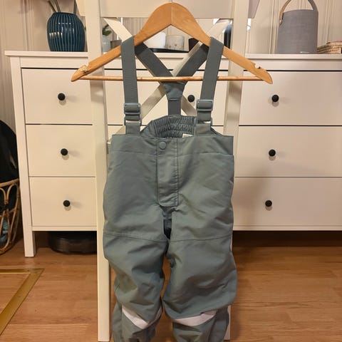 Buksen har plass til å vokse med en farget søm på innsiden som du kan ta av for å regulere størrelsen, noe som sikrer en komfortabel passform etter hvert som barnet vokser. Elastiske, regulerbare seler med plastspenner. Glidelåsgylf og vindstolpe med trykk-knapp skjult borrelås, elastikk bak, forsterkede partier på bena og ryggen i ekstra holdbart materiale som motvirker slitasje. Elastiske kanter nederst på bena og en avtakbar, forsterket elastisk stropp under foten som kan byttes ut for å forlenge buksens levetid. Refleksdetaljer på bena. Fôret
