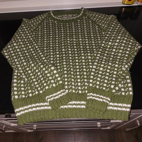 Selger denne flotte Islands-genseren som er hjemmestrikket. Den var ment for en i familien, men ble dessverre for liten.