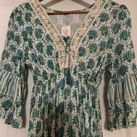 Kun brukt en gang. Strikk i livet så passer nok også en xl. Nydelig luftig kjole.