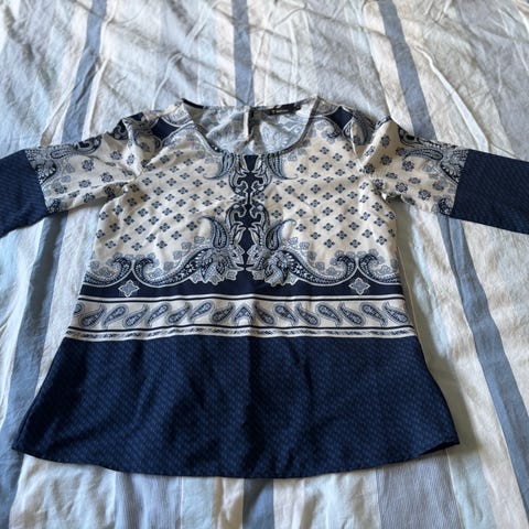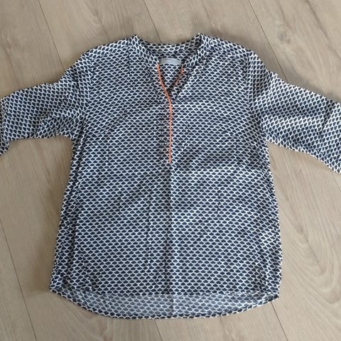 Stilig og lett topp fra danske Soya Concept i str. Medium. Den har et grafisk mønster i mintgrønt, svart og beige, og passer like godt til jeans som til skjørt.