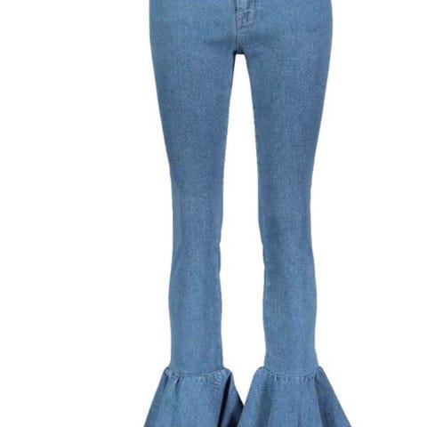Edikted retro blå jeans bootleg / flared / med sleng, med svart faux fur nederst, kjøpt på Dollskill, størrelse small