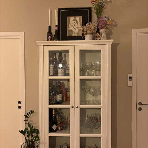 Fint vitrineskap selges ifbm. flytting. Ingen kjente skader eller bruksmerker med unntak av den lille, mørke flekken på toppen (avbildet).