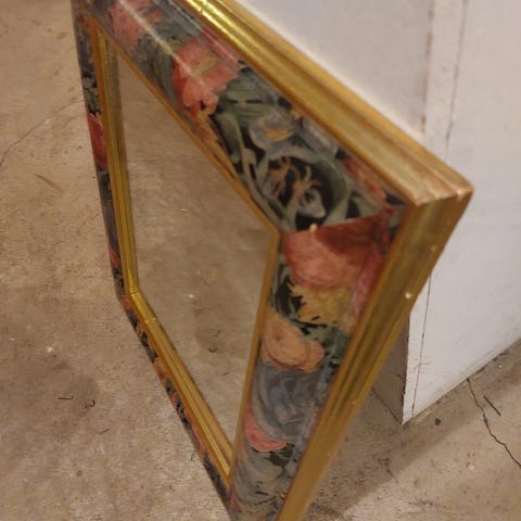 Det er en liten feil som bare er synlig når man ser nøye på den. Det er vanligvis ikke synlig. Rammen på speilet er laget av tre. Pris diskuteres i hurtigkjøp.