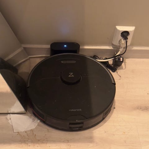 Veldig fin Roborock S7 MaxV Ultra robotstøvsuger med dokk. I dokken er det tank for skittent vann, rent vann og støvsugerpose.