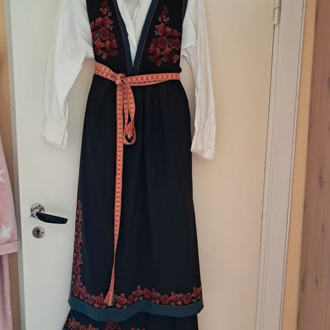 Fin gammel vest Telemark bunad, mørk blått stoff. Fine roser lokalt brodert. Stakk 94 cm ( passar ca 168 cm ), stort liv ca 100 cm og livvidde ca 80 cm. Utan veske. Ørlite falma på baksida. Må prøvast :)