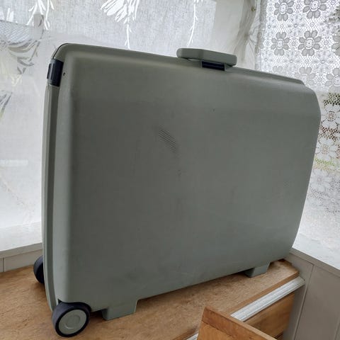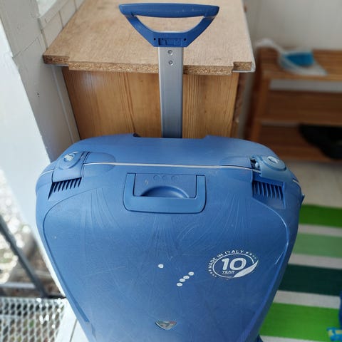 Koffert, cirka 58 centimeter høy. Glidelåsen er dessverre litt ødelagt, så den kan ikke åpnes helt! Ellers hel og fin