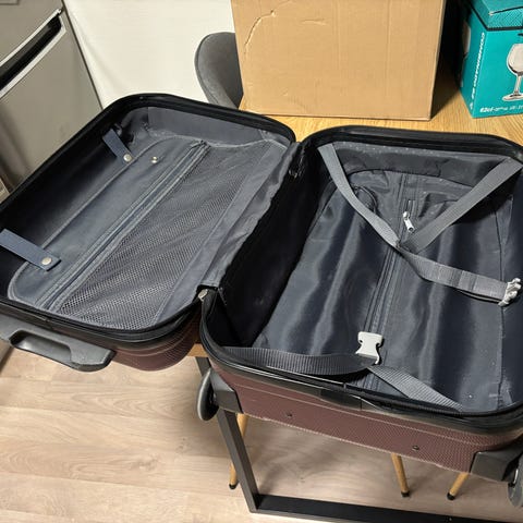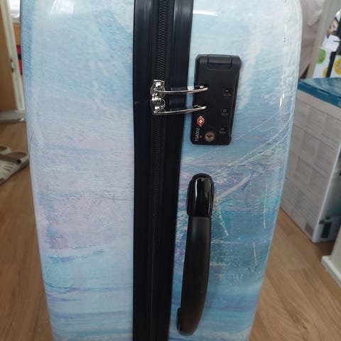 Fin koffert med glidelås som ikke går helt rundt.