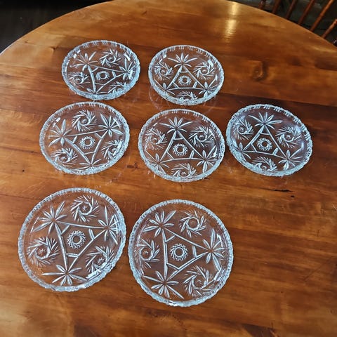 1 kakefat, diameter 30cm og høyde på kanten 4 cm + 6 dessertskåler/kakeasjetter med diameter på 15,5 cm, høyde på kanten 3cm. Helt og pent. Selges samlet for 500kr. Må hentes I Skotselv. Sender ikke.