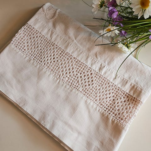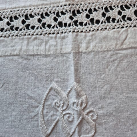 Vakkert antikk overlaken med bred håndheklet bord og monogram