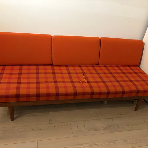 Flott Svanette fra Ekornes i originalt rustrødt stoff. Klassisk norsk designikon med fastmontert sidebord og slanke koniske ben. Kan brukes både som sofa og daybed.