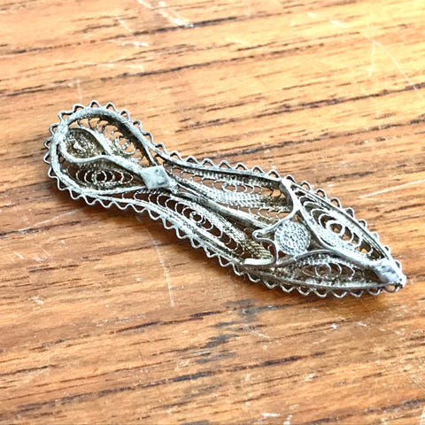 Flott gammel antikk engelsk Victoriansk brosje/nål med halvmåne fugl og blomster/eføy selges kr 475,-