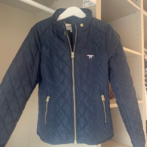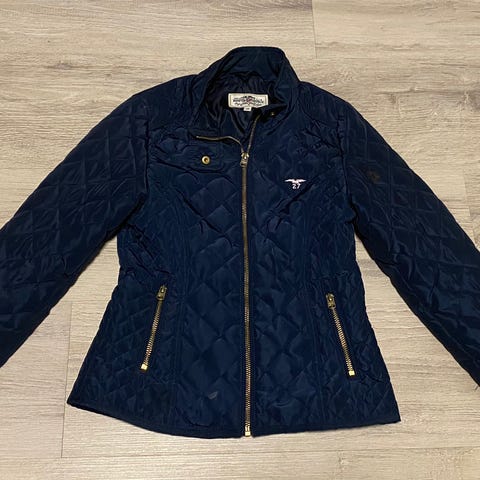 Jakke quiltet fra Hamptons Republic i str. 134 (9 år). Refleks bak. Nyvasket og svært lite brukt, men en av sømmene i quilten på et erme er borte. Det er ikke særlig synlig, men selges derfor rimelig. Vaskbar.