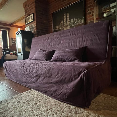 En sofa med madrass på topp som kan legges ut på siden for å lage en dobbeltseng.