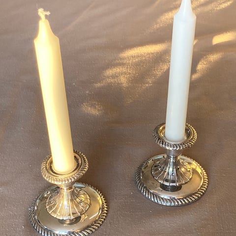To eldre pene sølv lysestaker. Stemplet 830 S. Noe bruksslitasje må påregnes. Utstøpt fot påsatt filter. Diameter ca 11,5 cm. Høyde ca 7 cm. Pris for begge.