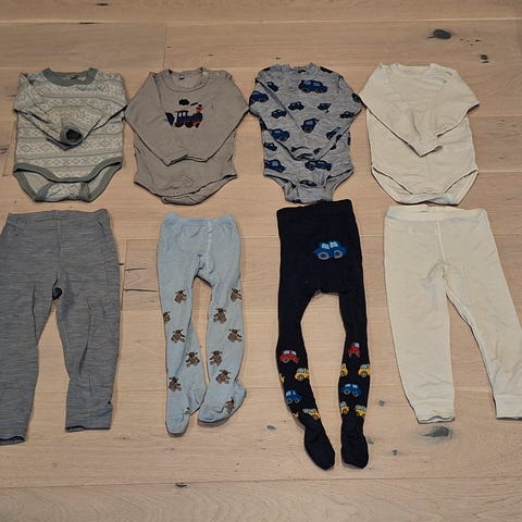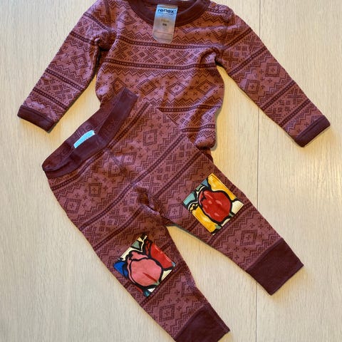 Reflex ullsett str. 74. 2 små hull nede på magen (se bilde). Litt grå over knærne på buksen