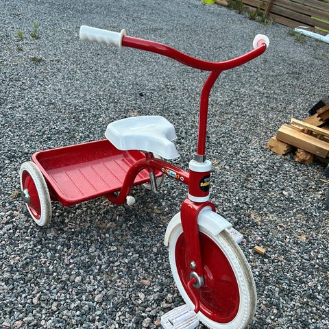 Klassisk 3 hjulssykkel med lasteplan som kan vippes opp.