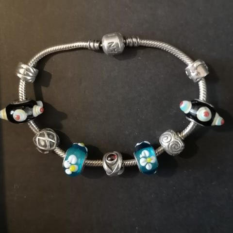 Armbåndet er i svært god stand. En av perlene har teksten: Live, love, laugh, dream.