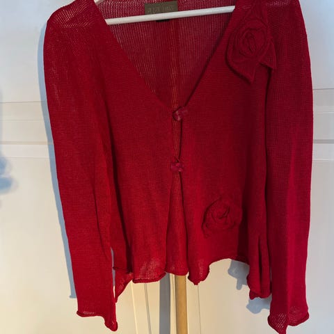 Nydelig kortermet cardigan i rødt, med perledetaljer på fremsiden og nede på ryggen ❤️