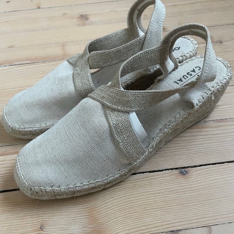 Demi er sandalversjonen med strikk på siden og åpen tå foran. Kilehælen er lav og innersålen like myk som de vanlige espadrillos skoene. Sitter godt på med den elastiske siden. Passer like godt på ferie til lette sommerplagg som hjemme med på en varm dag med bukse til. Kan enkelt se tøffere ut til en sort skinnbukse eller tøff denim. Men også som en pen sandal til kjole eller skjørt.