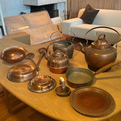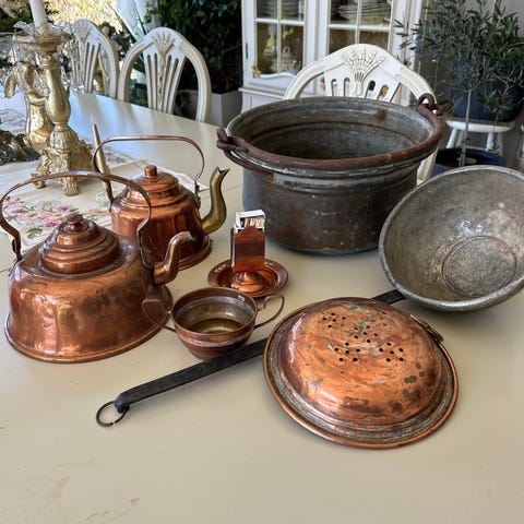 Forskjellige kobbergjenstander selges samlet 4 sleiver/sil og en kobberbolle