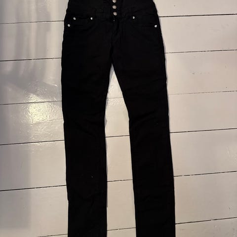 superstretchy stoff med en glatt overflate. Den har ekstra høyt liv med 4 knapper og en smal passform. Baklommene er plassert midt på rumpa.