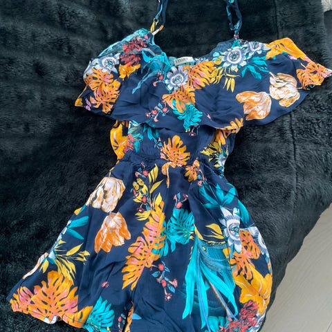 jumpsuit med blomstertrykk , trykk uten skuldre, sommerens feriestil