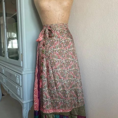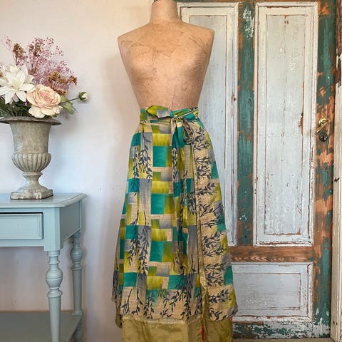 Kort Omslagsskjørt 🌞Det kan brukes på begge sider og er laget av flere lag med stoff så det er ikke gjennomsiktig og sitter godt på. Laget av en silkeblanding. Det har knytting som gjør at den kan tilpasses mange størrelser. XS-XL🧡 #sommer #festival #fargerik #skjørt #omslag #bohem #hippie #unik #spesiell #mønster #silke #design #luksus #kunst #cottage #orange #grønn #dansk #mote