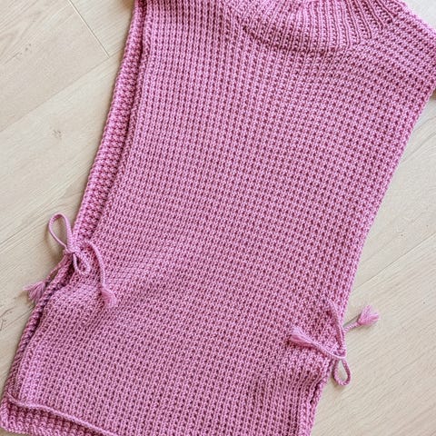Vesten er strikket i garnet Sandnes, en tråd Sunday farge 4343 og en tråd Tynn Silk Mohair farge 2321.