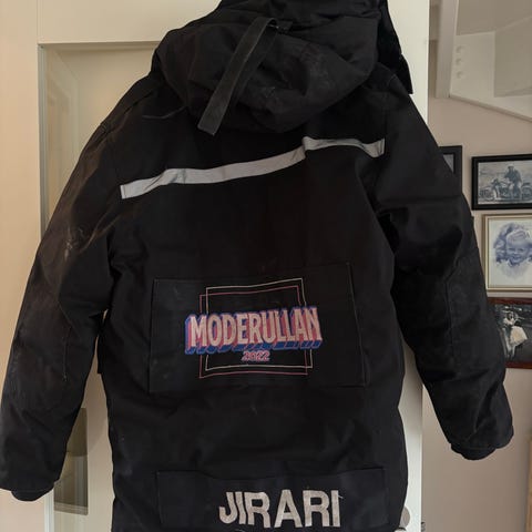 Russeparkas med hette i god stand. Holder godt på varmen, og er perfekt for kalde kvelder. Mange praktiske lommer. Størrelse S i unisex